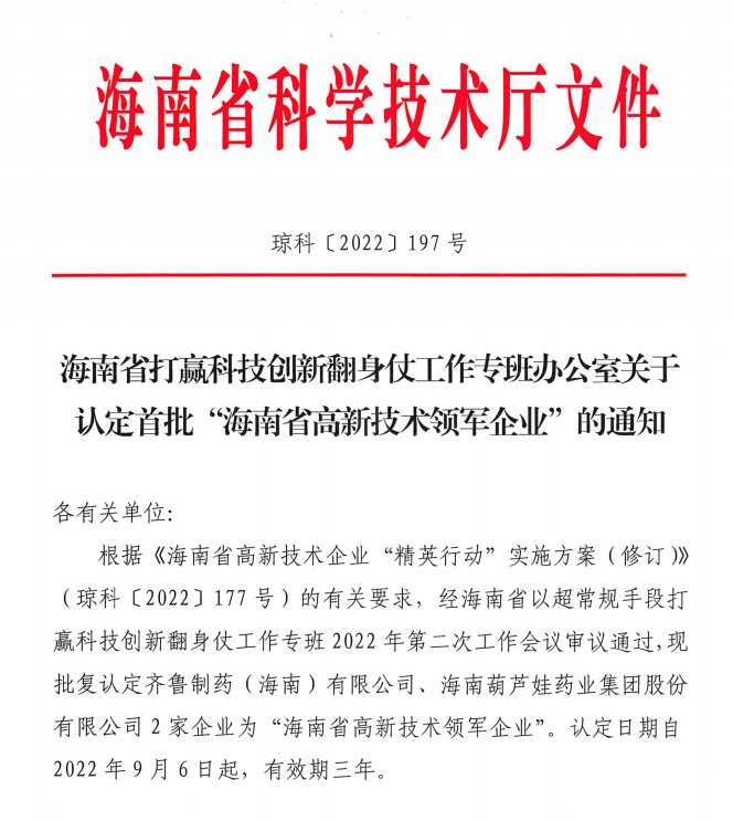 近日,海南省科学技术厅发布的《海南省打赢科技创新翻身仗工作专班办公室关于认定首批“海南省高新技术领军企业”的通知》中显示,批复认定海南PA视讯药业集团股份有限公司等2家企业为“海南省高新技术领军企业”。认定日期自2022年9月6日起,有效期三年。